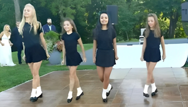 Cztery młode dziewczyny zaczynają tańczyć irlandzki taniec na weselu, gdy nagle na scenę wbiega panna młoda.